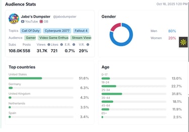 Jabo's Dumpster is a gaming content creator focused on Call of Duty, Cyberpunk 2077, and Fallout 4. His audience includes gamers, video game enthusiasts, and stream viewers who enjoy immersive gameplay and story-driven content. Through consistent uploads and engaging coverage of top gaming titles, he continues to attract viewers who value entertainment, strategy, and creativity in the gaming world.